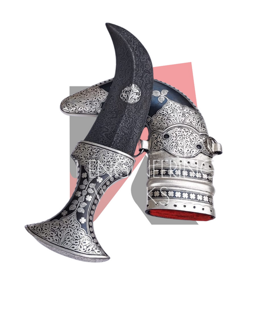 SILVER KOFTGIRI ARABIAN JAMBIYA DAGGER A jambiya, also spelled janbiya, jambya, jambia and janbia (Arabic: جنۢبية janbīyah), is a specific type of dagger with a short...