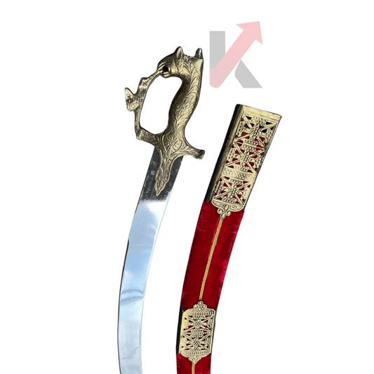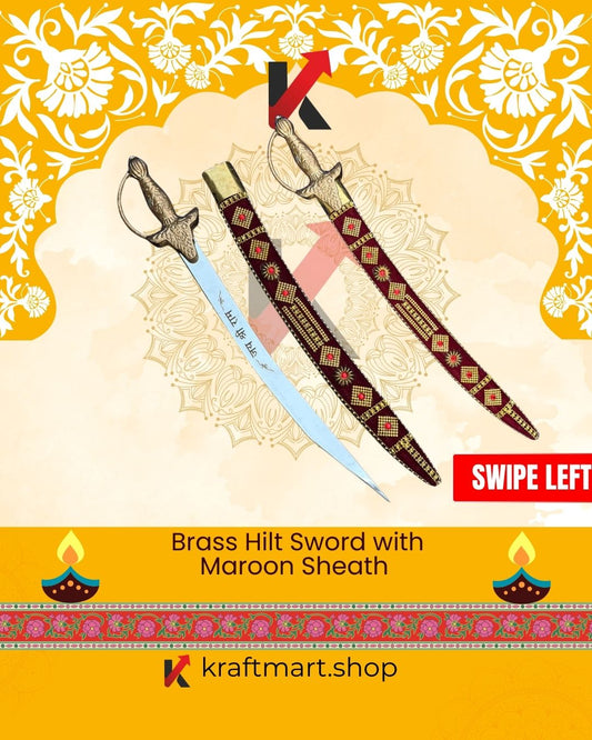 Brass Hilt Sword with Maroon Sheath NAVRATRI SALE IS LIVE. SHOP NOW FROM KRAFTMART.SHOP Product Description Length- 21 inches, 23 inches with scabbardBlade - Mild Raw steel...