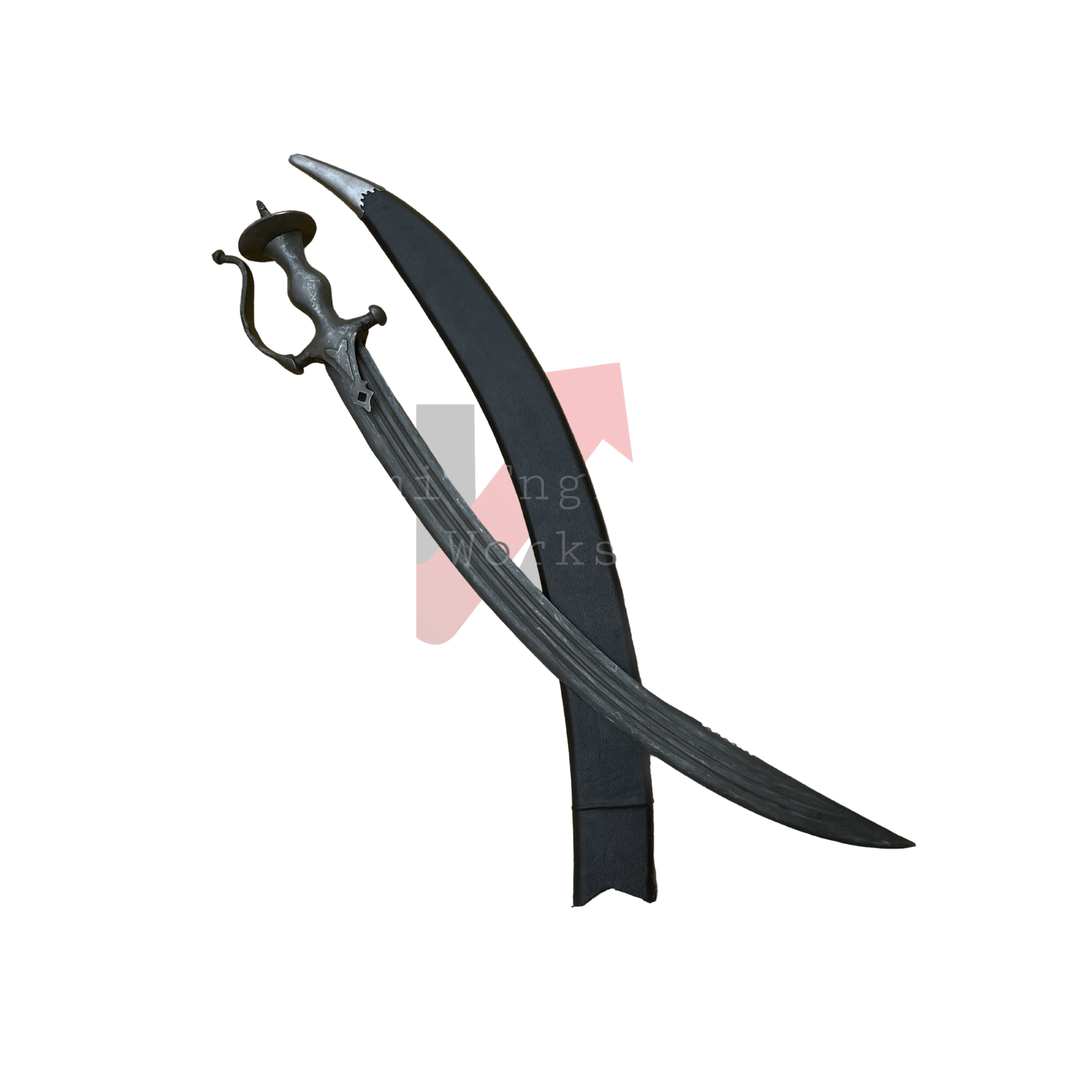 This antique handmade sword is a collectible that will make a great addition to your collection. The blade is made of Wootz steel . The handle is made of metal and is single-handed. The sword is single handed and has a black color on blade . It is a reproduction of the original Sword Tegha 1910, making it a perfect addition to any collector's collection. SPECIAL TEETH/ZIG ZAG DESIGN ON THE TIP OF BLADE